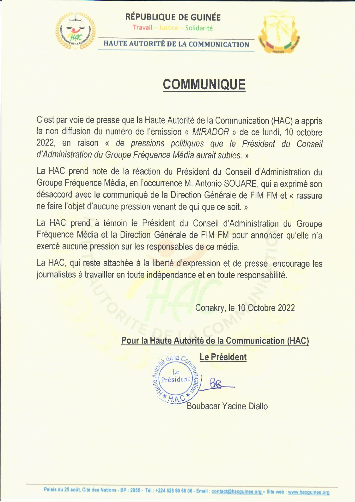 L’article Non-tenue de l’émission Mirador : la HAC se prononce… est apparu en premier sur Mediaguinee.org.